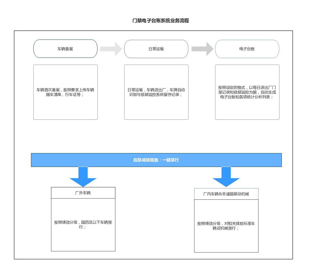 参照《重污染天气重点行业移动源应急管理技术指南》,利用现代科学技术手段建立一套符合环保要求,企业实用的“门禁电子台账系统”,通过大数据分析对接国家机动车环保数据平台,判定排放超标车辆一键禁行,助力企业规范车辆秩序,积极配合环保用车管控,助力打赢蓝天保卫战。