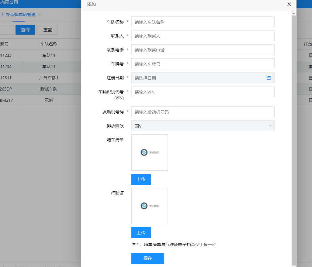 厂外运输车辆添加备案内容页