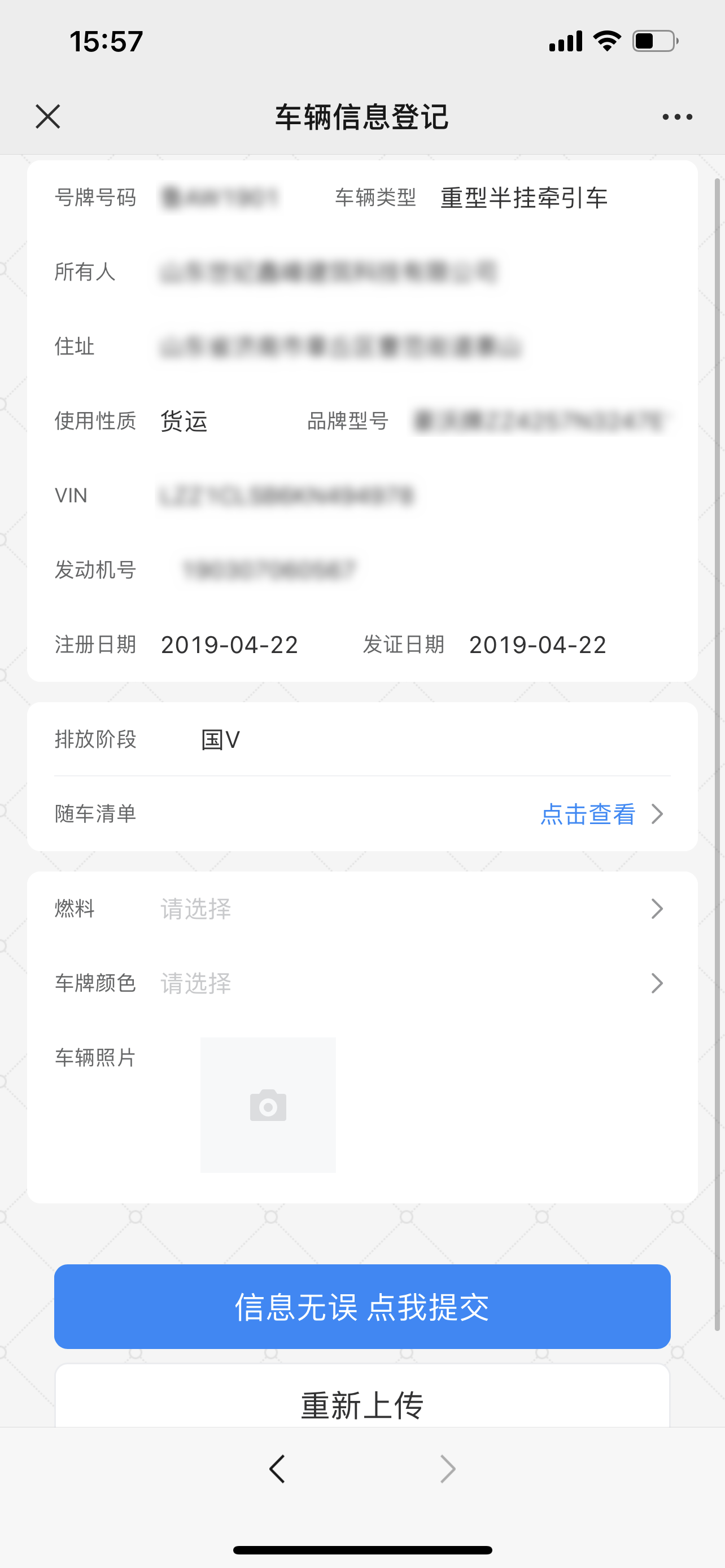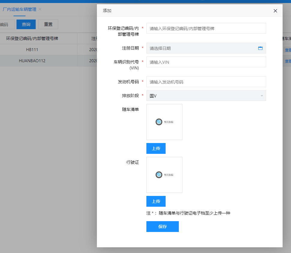 系统支持多图片上传,无法识别车辆进入需要上传的环保清单照片,发动机号、行驶证等图片的内容可以上传并存储备案。